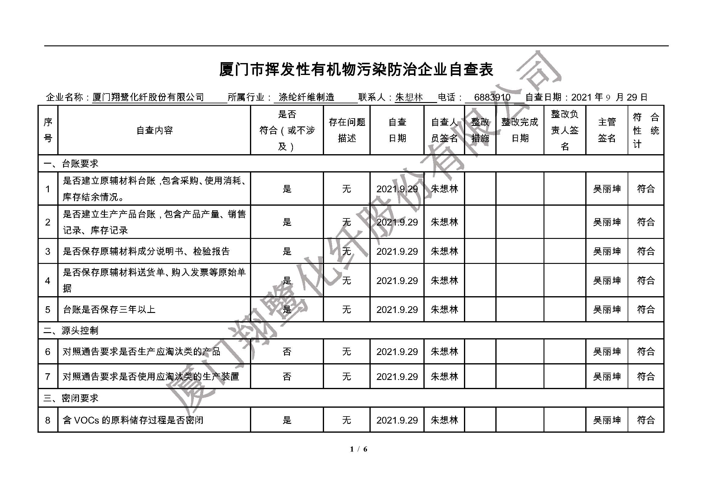 廈門市揮發(fā)性有機物污染防治企業(yè)自查表(2021年 第二季度)